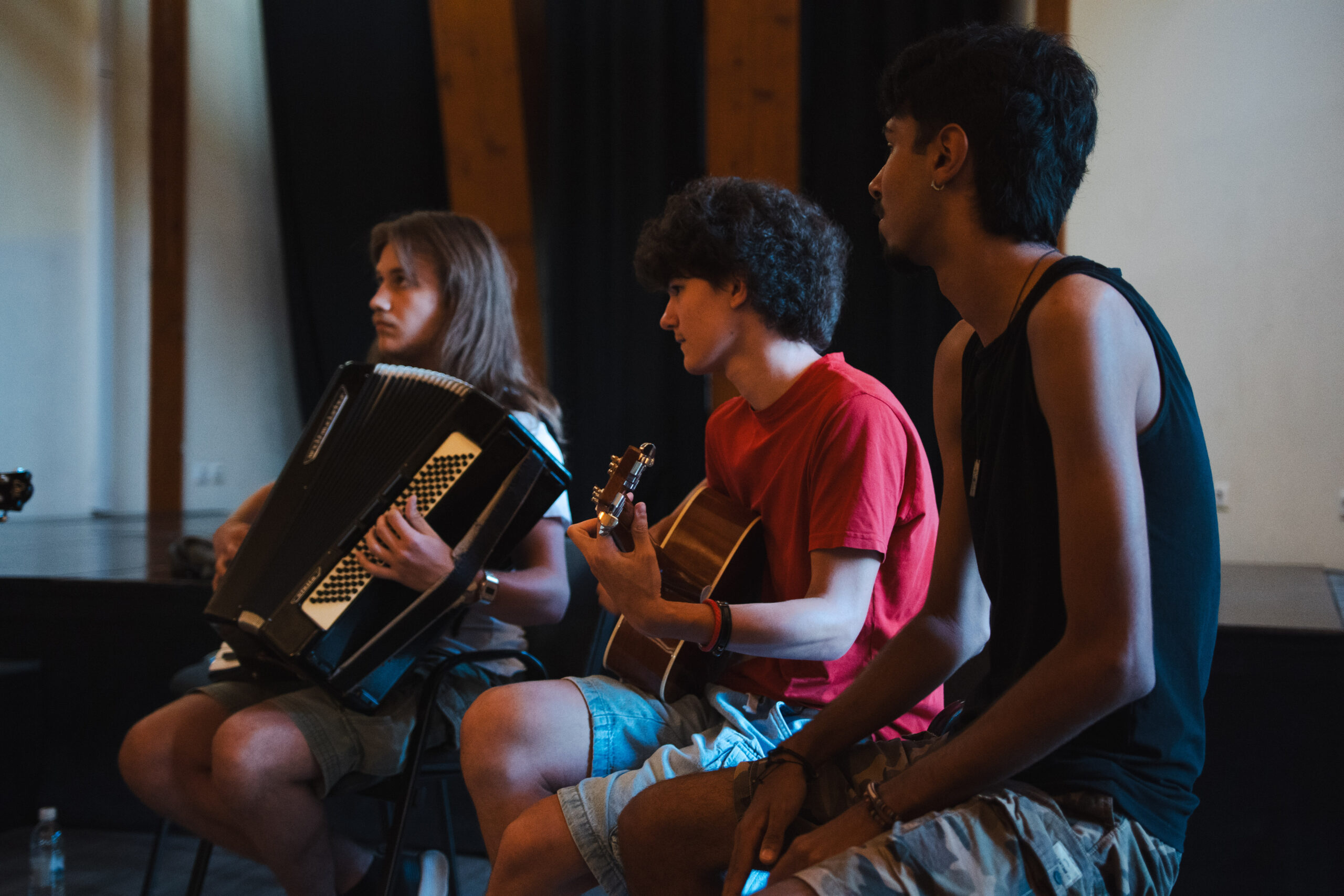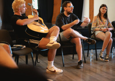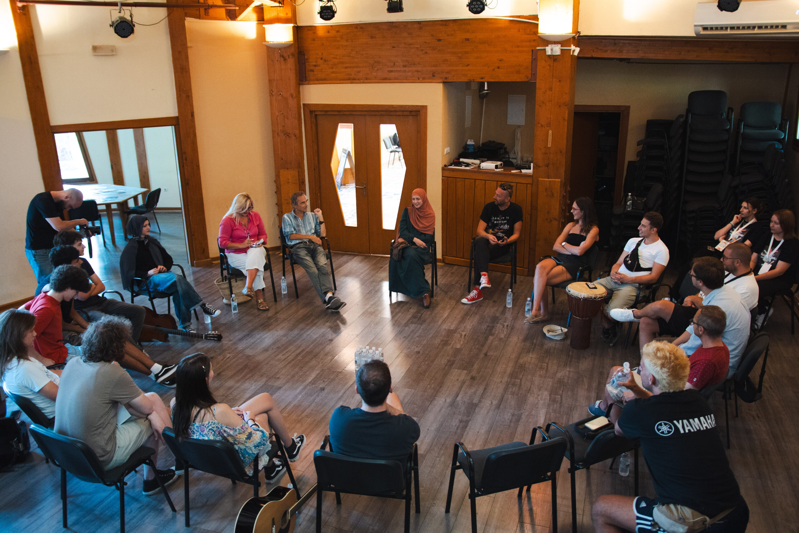 U Kući plamena mira održana je radionica sa članovima benda Funk Shui iz Skoplja, poznatog po jedinstvenoj fuziji žanrova i scenskoj energiji. Tokom radionice, članovi benda su govorili o procesu stvaranja muzike, timskoj dinamici unutar benda, komunikaciji s publikom i izazovima muzičke industrije u regiji.