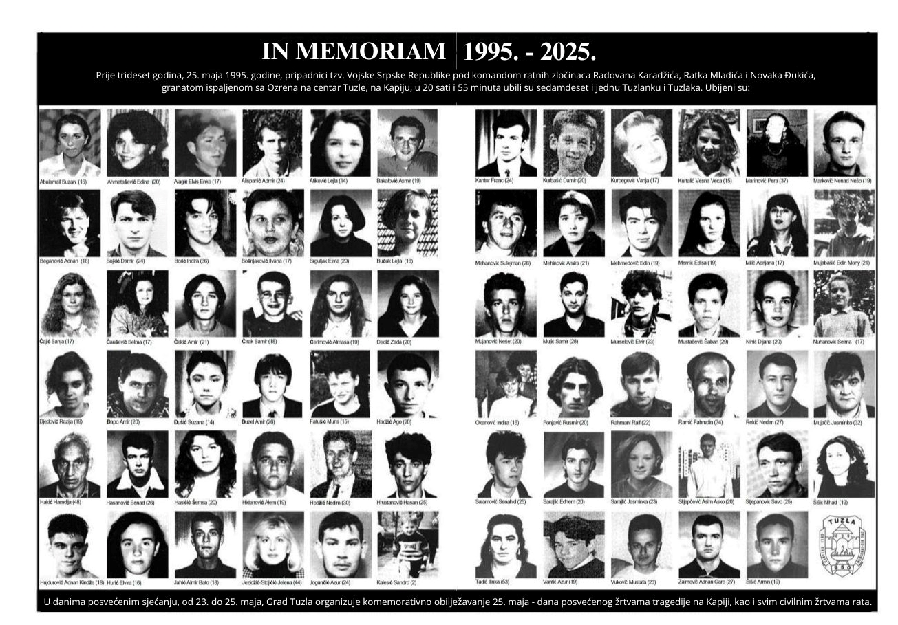 Prije trideset godina, 25. maja 1995. godine, u 20 sati i 55 minuta, granata ispaljena sa položaja Vojske Republike Srpske sa planine Ozren, po naređenju ratnih zločinaca Radovana Karadžića, Ratka Mladića i Novaka Đukića, pala je na Kapiju – najpoznatije okupljalište mladih u Tuzli.