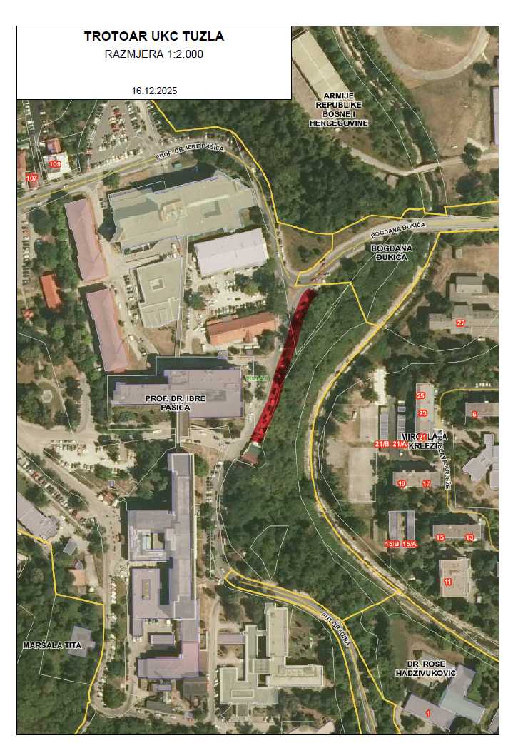 Služba za komunalne poslove, izgradnju i poslove mjesnih zajednica obavještava građane da će od srijede, 17.12.2025. godine, započeti izvođenje radova na sanaciji dijela trotoara u ulici prof. dr. Ibre Pašića, uz desnu saobraćajnu traku ulice, gledano iz pravca juga (od posljednjeg kioska ispod objekta UKC-a Tuzla do skretanja u ulicu Bogdana Đukića).