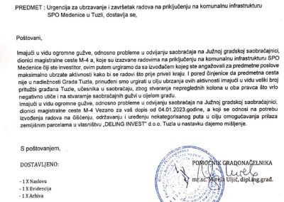 Iako se ne radi o cesti iz nadležnosti Grada Tuzle, Služba za komunalne poslove, izgradnju i poslove MZ Grada Tuzla je poslala urgenciju investitoru navedenih radova da se radovi što prije okončaju i uspostavi normalan režim saobraćaja na ovoj dionici magistralne ceste M-4.