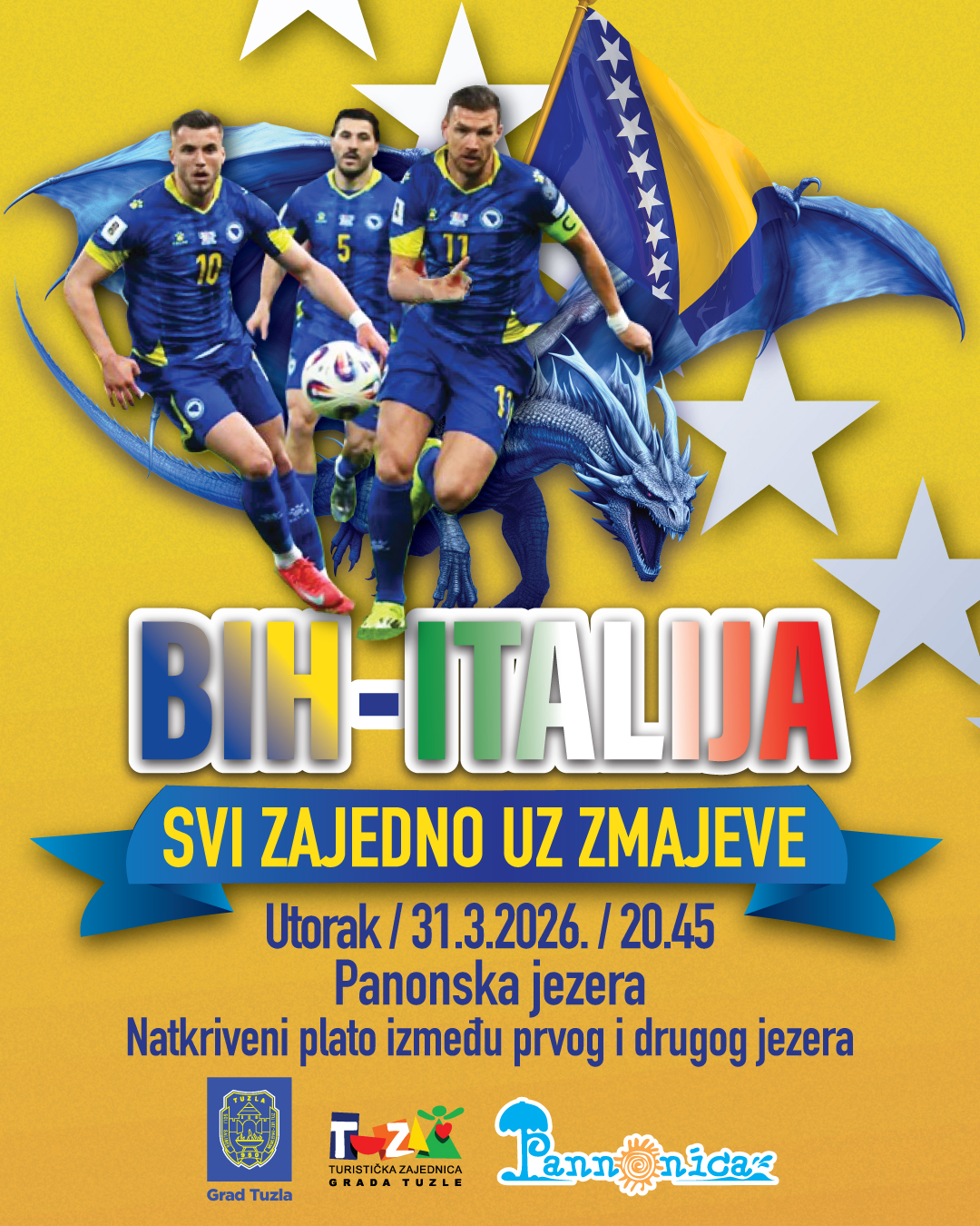 Javno praćenje utakmice Bosna i Hercegovina – Italija bit će organizovano u utorak, 31. marta 2026. godine, s početkom u 20.45 sati, na Panonskim jezerima u Tuzli, na natkrivenom platou između prvog i drugog jezera.